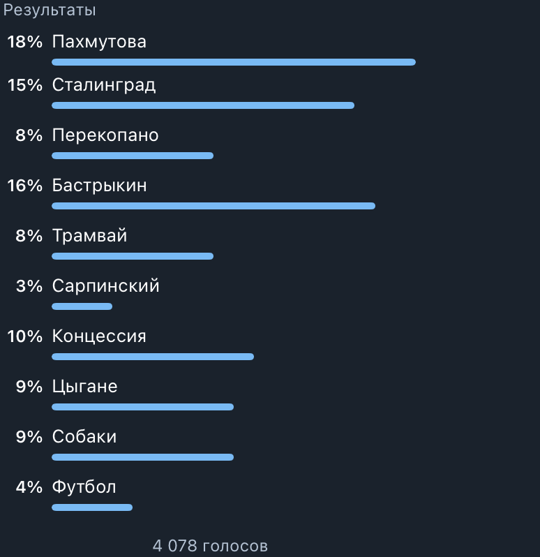 Далее места распределились так: «концессия» — 10%, «цыгане» и «собаки» — 9%, «трамвай» и «перекопано» — 8%, «футбол» — 4%, «Сарпинский» — 3%.