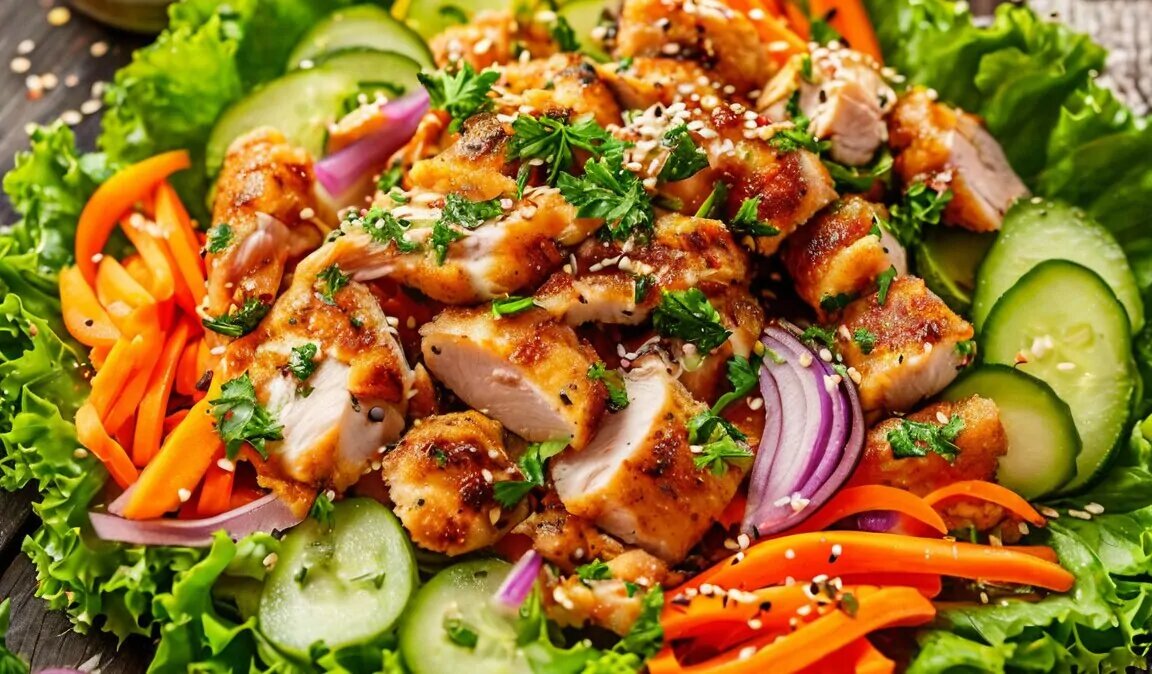 - На дно большого салатника выкладываем листья салата. Сверху распределяем маринованные овощи: огурцы, морковь и лук, затем добавляем острую курицу. Поливаем все оставшиеся маринадом, который остался после обжарки курицы.