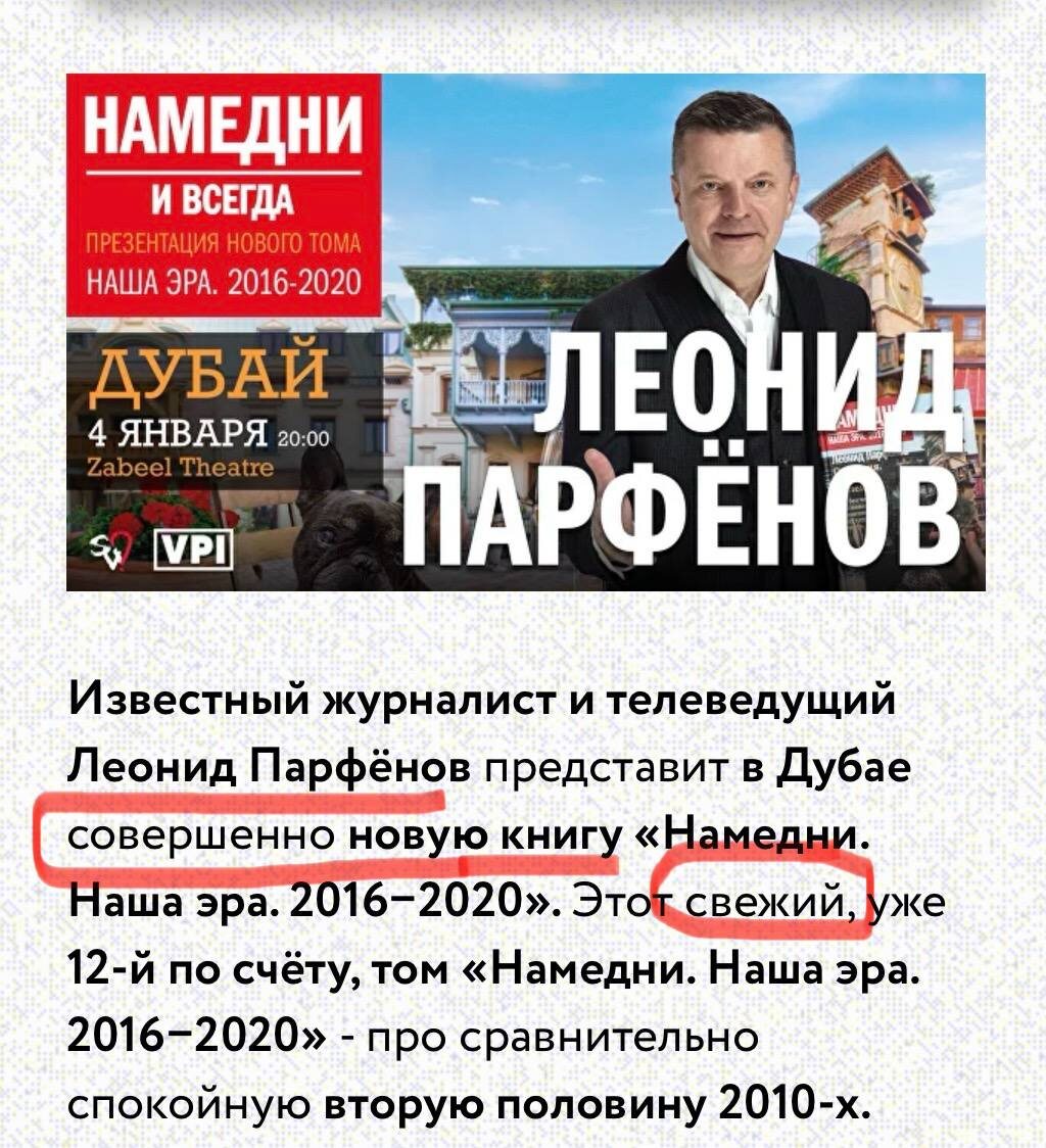 Леонид Парфенов активно зовет со страниц своих соцсетей всех поклонников его программы "Намедни" в частности и журналистского таланта в общем на собственное выступление в Дубае, которое состоится 4 января 2025 года. Цены на билеты не демократичные - начинаются от 85 долларов (8, 5 тыс рублей). На мероприятии все еще не иноагент Парфенов обещает представить публике "совершенно новую книгу «Намедни. Наша эра. 2016−2020»." "«Денег нет, но вы держитесь», «Петров с Бошировым», Грета Тунберг, Голунов, PokemonGo, коронавирус и другие явления, события, люди, определившие день вчерашний и день сегодняшний — обо всём этом рассказывается в новом томе «Намедни», - говорится в анонсе мероприятия. Все прекрасно. Только вот почти ровно год назад - 29 января 2024 года ровно там же в Дубае, Леонид Парфенов уже приглашал всех желающих на ровно такую же презентацию этой же самой "совершенно новой книги «Намедни. Наша эра. 2016−2020»." Кстати, на вопросы "вторичности" новинки, которые особо внимательн