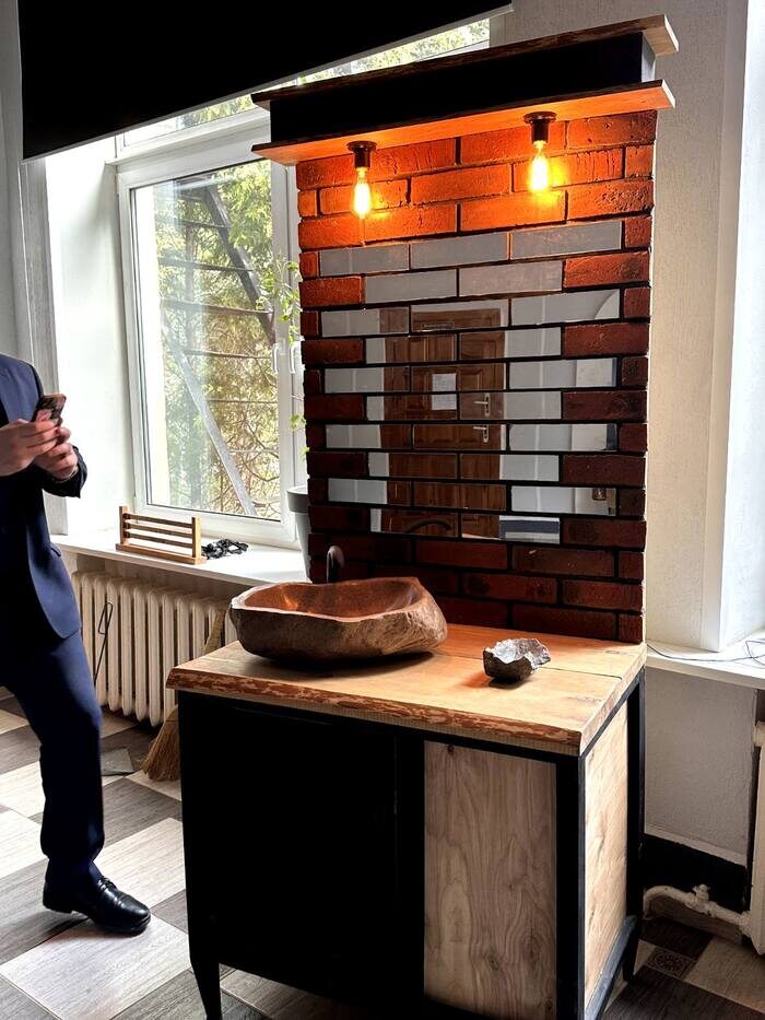 В рамках внеурочной работы с детьми, мы практикуем изготовление изделий с нестандартными решениями. Вот что получилось в этот раз. Задумка вылилась из такого события. Как то мы пилили старинный кирпич. Достать такой можно разобрав старые деревенские печи. Прелесть такого кирпича, в неоднородности текстуры и цвета на разрезе. Разрезали такой кирпич, а дальше, все как в тумане. Решили сделать кухонный гарнитура. Да не простой. Кирпич, зеркало, раковина из камня. В вообщем, смотрите картинки. Набрали панно с зеркалом, начали заполнять пространство фугой. Черный цвет, кирпич, массив древесины. Мастер паралельно занялся раковиной. Долото, молоток. Все как в традиционном ремесленном деле. Промежуточный результат, осталось отшлифовать, отполировать, просверлить сливное отверстие. В результате получилось вот это. Столяра сделали тумбу стол и можно собирать. Увесистая штука. Привет столярной мастерской иии... Готово! Вот ещё немножко работ. Под пряности. Вот как то так. Учите детей творчеству.
