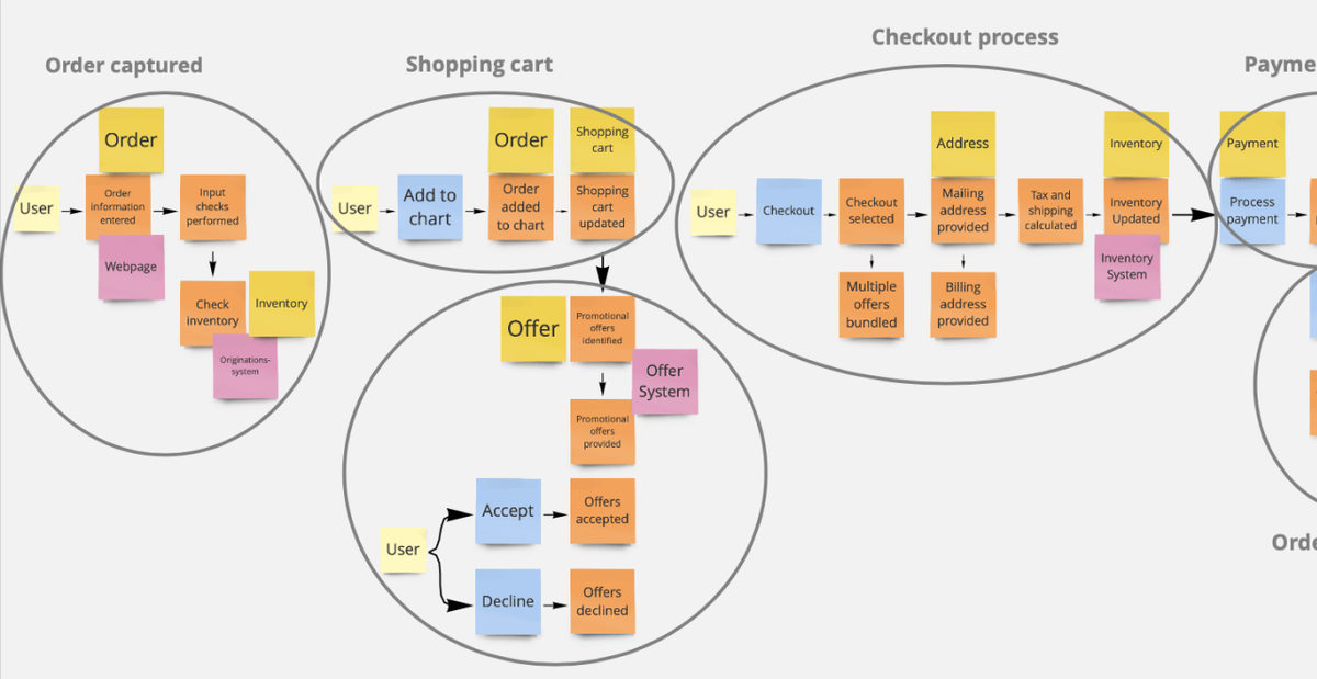 - Доменные события: Ключевые изменения состояния в системе, обозначаемые оранжевыми стикерами. Примеры: «Заказ размещен», «Платеж получен», «Товар отправлен».