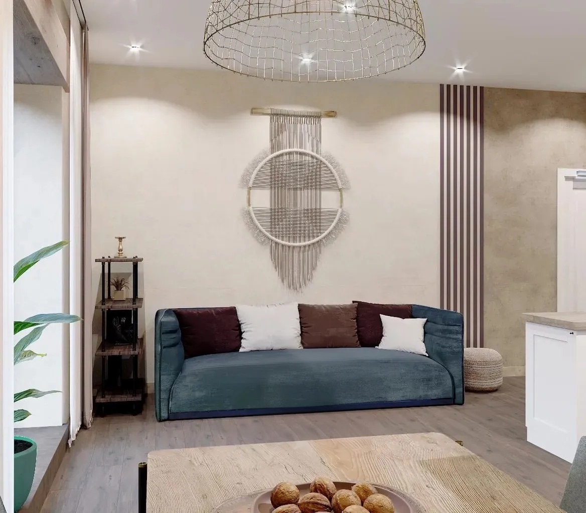 Штукатурка, рейки, плетеные материалы. Это отсылка к этническим артефактам, которые могут появиться в интерьере. Это второй проект с отсылкой к историзму и этническому стилю. Здесь много заморской мебели: сундуков, плетеного декора из веревок, которые очень популярны на Бали, плетеных низких сидений, текстуры дерева.