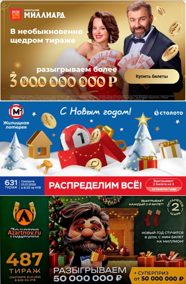 Приветствую всех!!! Сегодня небольшой анонс новогодних тиражей от столото и национальной лотерее. В "лото" по стандарту разыграют 1 млрд рублей, обещают разыграть более 3 млрд рублей за тираж. В "мечталлион" обещают разыграть более 1 млрд рублей. В жилищной лотереи и золотой подкове будут распределительные тиражи. Разыграют более 3 млрд рублей, основные призы: 1 млрд рублей и 100 призов по 1 млн руб. Будет распределительный тираж, останется 1 шар. Разыграют 50 млн рублей, останется 2 шара. В мечталлион обещают разыграть миллиард на всех. Вот такие тиражи ожидают нас в первый день 2025 года. "Если суждено выиграть хватит и одного билета". В последнее время играю мало, бюджет в последнее время не позволяет тратить лишние деньги. Вот несколько выигрышей за последнее время. Помощь на развитие канала 2202202474119827. Тут вот повезло в Топ 12. Вот из последних. Вот как то так!!! Ничего особо крупного в последнее время нет, так как почти не играю в лотереи и везения в последнее время не оч