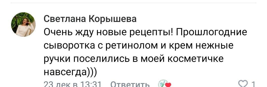 😊 Рецепт, теперь уже проверенного временем идеального крема. Если кто-то пропустил или недавно на моем канале крайне рекомендую сделать этот крем. Побаловать кожу рук, защитить и восстановить ваши руки зимой, да и в любые другие временя года)) снять сухость после использования моющих средств. Этот крем для рук на основе обратной эмульсии. Рецепт: Фаза А Вода до 100% NaCl (соль) 0,9% Аллантоин 0,5% Глицерин 3% Фаза В Масло жожоба 2% Масло миндаля 3% Масло конопли 2% Цетиол СС 3% Имвитор 600 3.5% Комплекс витаминов А, Е, F 3% Липофолк 2% СО2 экстракт граната 1% Фаза С Д-пантенол 1% НУФ 2,5% Концентрат алоэ 2.5% Эфирное масло лаванды 0,2% Эфирное масло розового дерева 0,2% Эфирное масло мандарина 0,4% Эфирное масло ромашки римской 0,1% Шаромикс 721 0,6% 1. Соедините компоненты фазы А: в горячей (60-80 градусов) воде растворите аллантоин, соль, добавьте глицерин. 2. Соедините компоненты фазы В, смешайте миксером 3. При постоянном перемешивании, капельно вводите А в В. Когда введете