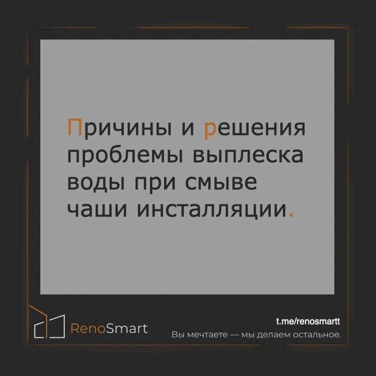 Этим грешат преимущественно безободковые унитазы. Не все, но бывает. Причины и решения 1.Отсутствие или неправильная установка рассекателя потока. У некоторых моделей инсталляций этот элемент изначально установлен в чаше еще на этапе производства. 2.Унитаз установлен не по уровню. Всего нескольких миллиметров влево или вправо — вполне достаточно. Чем больше угол наклона, тем больше выплеск. 3. Отсутствие или неправильная установка ограничителя потока. После монтажа инсталляции с помощью ограничителя можно настроить количество подаваемой воды при нажатии клавиши. В большинстве инсталляций все элементы можно заменить через кнопку смыва. 4.Обязательно собирать инсталляцию строго по инструкции! Этим часто пренебрегают даже опытные сантехники. 5.Тестовый смыв. Перед герметизацией чаши инсталляции сделайте пробный смыв. Реносмарт. Вы мечтаете, мы делаем остальное.