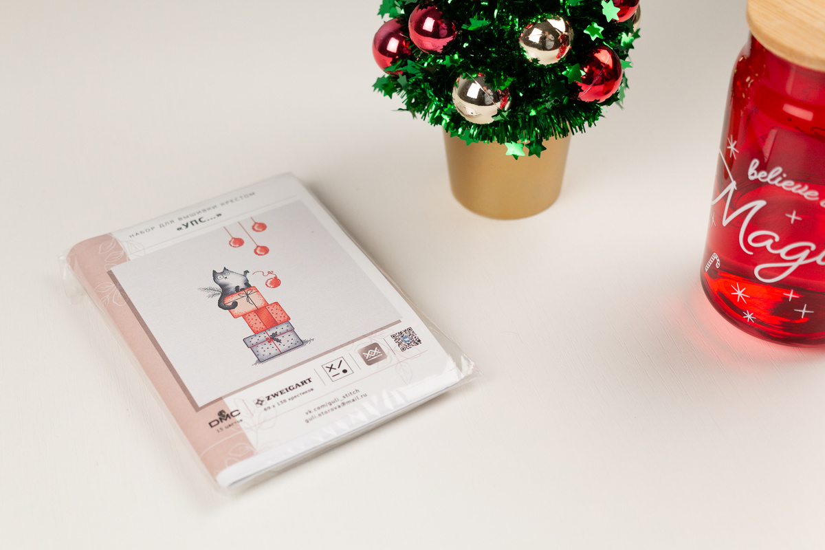 Всем привет! Этот набор для вышивания я купила зимой этого года на Формуле рукоделия, специально, чтобы вышить его к Новому году. Это сюжет из серии "Новогодний котик", я купила только его - больше всех понравился. Теперь интересно, что там еще было, потому что сама я уже не помню. Это очень легкая работа. Тут всего 15 цветов + 2 смешанных цвета (бленды). Ниточки - DMC, основа - равномерка. Схема в двух вариациях - без бэка и с ним. Ниток достаточно. Я разок ошиблась, на стыке листов схемы неверно начала вышивать и не сразу заметила. Пришлось распороть приличный кусок, но ниток все равно хватило. В итоге получился вот такой результат: Отнесла в багетную мастерскую, и оказалось, что этой вышивке идут очень многие рамки! Выбрать было не так-то просто, но в итоге остановилась на светлом сером варианте с красными вкраплениями - очень здорово перекликается с цветами ниток. Красота! Спасибо за внимание и с наступающими праздниками!