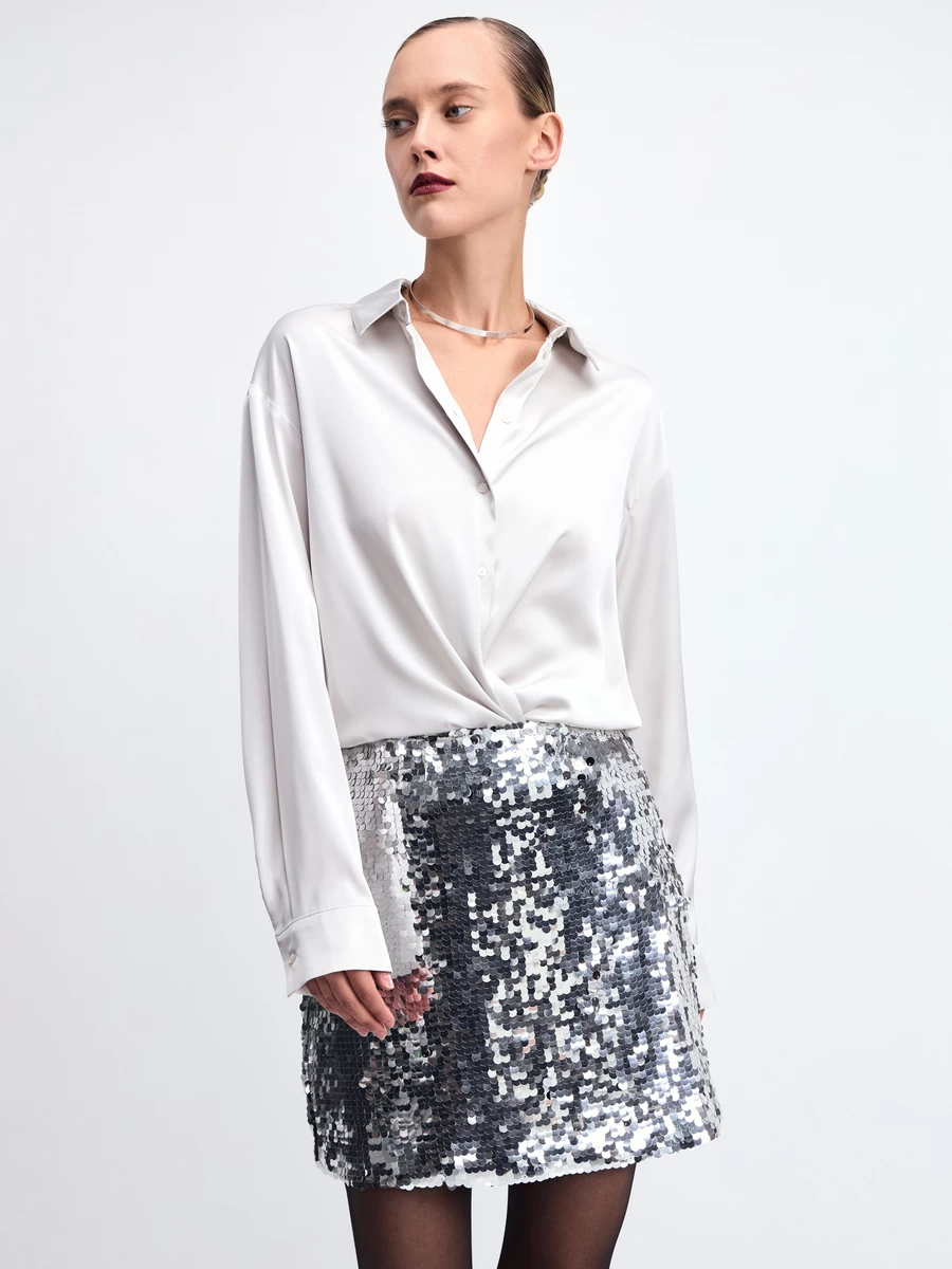Купили юбку с пайетками и думаете, что это покупка "одноразовая"? Так, выйти покружиться в новогоднюю ночь и убрать подальше в шкаф? А вот и нет. На самом деле юбка с пайетками – та вещь, которая прослужит в вашем гардеробе не один сезон. Покупаете на корпоратив, а потом сможете надеть с самыми разными вещами из вашего гардероба. Юбка может быть серебристой, золотой, черной. Но, на мой взгляд, серебристая – самая универсальная и всесезонная. Вот 10 идей, с чем носить юбку в пайетках: Возможно, образ, который вам первым придет в голову. Рубашка может быть либо атласной, либо хлопковой. В первом случае получится более нарядный образ, в вот с хлопковой рубашкой – более будничный. Как сделать образ еще более расслабленным? Расстегните пару верхних пуговиц на рубашке, а на ноги вместо туфель, наденьте кроссовки. Если выберете юбку с пайетками длины мини, то лучше всего она будет смотреться с укороченным жакетом. Например, серым. Проще не придумаешь. Но чтобы образ смотрелся гармонично,