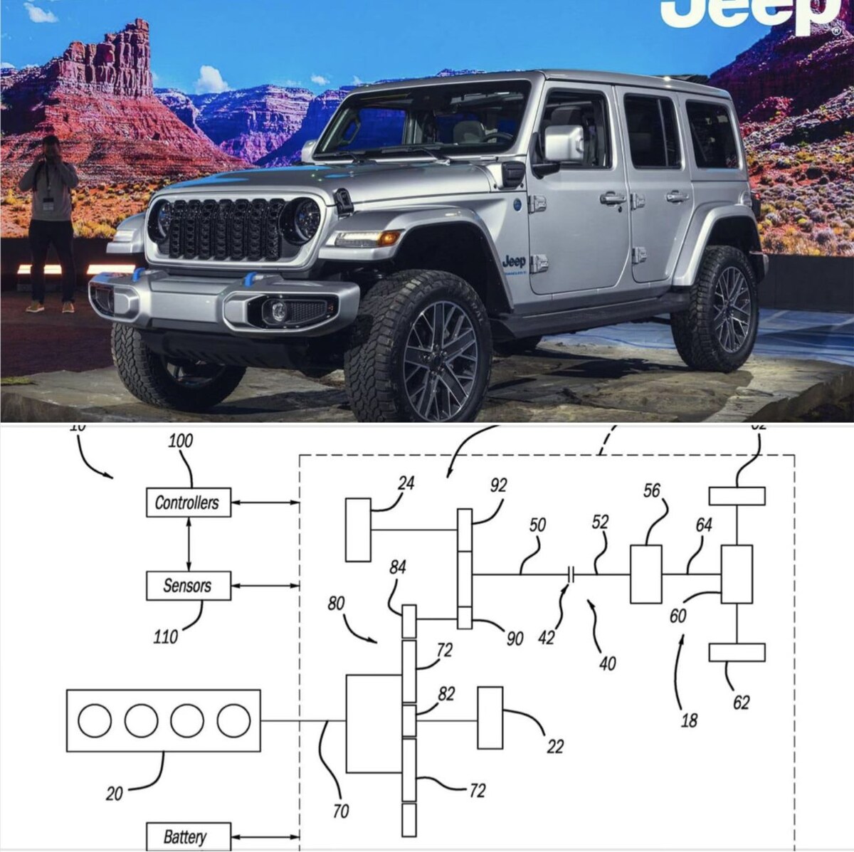 Наиболее интересной версией Jeep Wrangler сейчас является гибридная. Почему? Всё просто: А вот гибридный плагин с его 380 л.с. становится золотой серединой. Мощности достаточно, чтобы уверенно чувствовать себя и на трассе, и на бездорожье. Масса сопоставима с версией на V8 из-за батареи, но за счёт грамотной развесовки — батарея расположена в центре базы — гибрид не "клюёт" носом на сложных участках. Wrangler гибридной версии скоро получит ещё одну фишку, которая делает его ещё интереснее. Stellantis Group (владельцы Jeep) недавно запатентовали уникальную систему для гибридов: Теперь пониженную передачу в раздатке можно включать прямо на ходу. На бездорожье возможность подтыкать понижайку на ходу — огромное преимущество. В сложных условиях, где каждое переключение может сэкономить время и сохранить ход машины, такая система будет очень кстати. Теперь водители смогут: Эта технология действительно может стать революцией для гибридного Wrangler и вывести его на новый уровень в сегменте вн