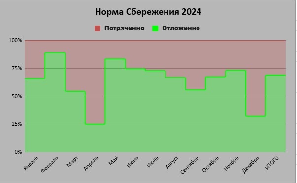Всех приветствую, В последнем месяце уходящего года удалось отложить 32% Это практически годовой минимум меньше было только в апреле 25%. Но там был отпуск, который был оплачен сразу из зарплаты. Ну да ладно. В целом по году удалось отложить 68%. Это радует, но думаю в 2025 году результат повторить и даже приблизиться к нему не получится. С другой стороны смотря сколько приносит портфель и вклады, главное не тратить. В ноябре норма сбережения была - 73% Тут правда была практически двойная зарплата А вот год назад в декабре 2023го норма сбережения составила - 75% Ну а теперь к расходам Ну тут закупки на новогодний стол, который по традиции растягивается на половину праздников Тут все стандартно, 27700 платеж остальное докидываю в досрочное погашение для ровного счета :) Часть расходов была в ноябре. Тут уже остатки по подаркам и покупка билетов на развлечения на праздники. Ну и по мелочи немного пиротехники. Тут впервые за долгое время расходы на бензин. Помощь родителям ну и прочие мел