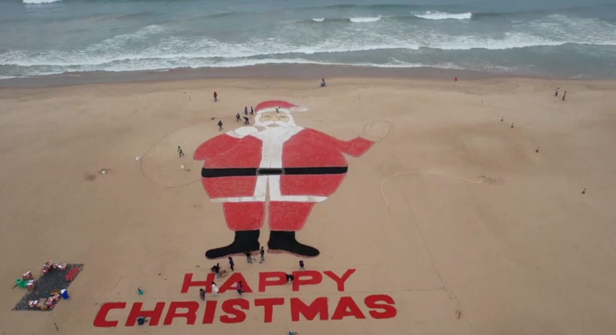 Известный индийский художник по песку Сударсан Паттнаик и десятки его учеников создали гигантское изображение Санта-Клауса, чтобы стильно встретить канун Рождества на пляже Пури, штат Одиша. На кадрах, снятых во вторник, видно изображение Санта-Клауса в его фирменном красном костюме с надписью «Счастливого Рождества». Паттнаик и его помощники также были замечены за работой над скульптурой: они рассыпали песок и бросали шоколадные батончики на тело Санты, чтобы создать произведение искусства. «Это очень сложно для нас, художников по песку, потому что мы делаем скульптуры на пляже, где дождь опасен для нас, поэтому мы боремся за то, чтобы творить как можно быстрее», — поделился художник, рассказывая о трудностях во время создания песчаного Санты. По словам Паттнаика, на создание инсталляции длиной 160 футов (48,8 м) и шириной 100 футов (30,48 м) ушло около шести часов, и в ней было использовано 550 килограммов шоколада. Цель художника — установить еще один мировой рекорд в этом впечатляю