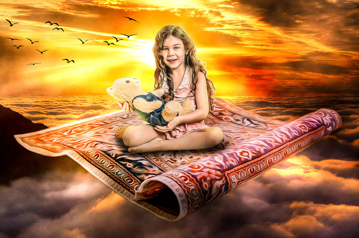 - «На ковре-самолёте мы летим в будущее! На ковре-самолёте, как на крыльях, мчимся мы вперёд. За плечами у нас — груз забот, но мы не унываем, потому что знаем: всё, что нужно, мы найдём, всё, что задумали, — мы воплотим в жизнь, и все невзгоды — победим. На ковре-самолёте мы летим к своим мечтам, К тем вершинам, которые мы покорим только сами. Мы летим навстречу солнцу, ветру и своей̆ судьбе, И пусть будет небо ясным, и пусть будет мир на земле»