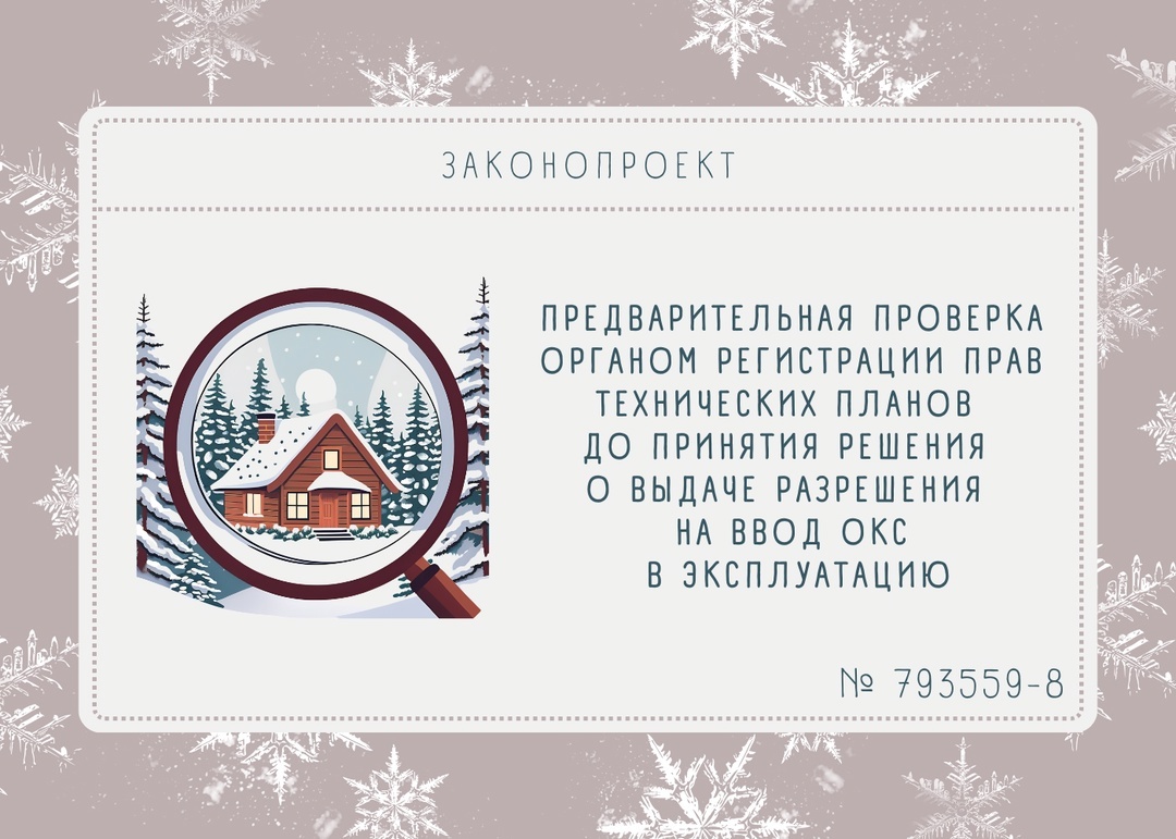 В Госдуму РФ внесён законопроект, предусматривающий возможность предварительной проверки технических планов созданных объектов недвижимости перед вводом в эксплуатацию в целях сокращения срока введения их в оборот. Согласно законопроекту уполномоченные на принятие решения о вводе объектов в эксплуатацию органы власти определяют целесообразность установления процедуры проверки технических планов до направления пакета документов с заявлением в орган регистрации прав. Для установления такой процедуры они смогут заключать соответствующее соглашение с Росреестром. В соглашении будут определены: Исходя из позиции органов власти субъектов РФ и территориальных подразделений Росреестра инициатива имеет ряд недостатков: Сократит ли процедура предварительной проверки Росреестром технических планов сроки введения в гражданский оборот объектов недвижимости? Делитесь мнениями в комментариях! С полным текстом законопроекта можно ознакомиться по ссылке: https://sozd.duma.gov.ru/bill/793559-8