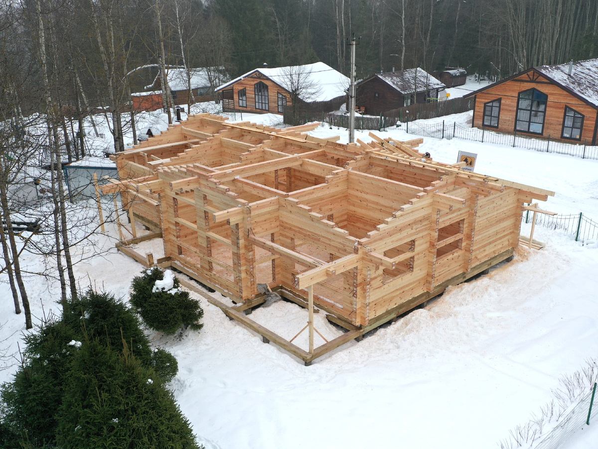 Промежуточный этап строительства одноэтажного дома 193,21 м² со смежным гаражом из профилированного бруса камерной сушки сечением 190х140 мм