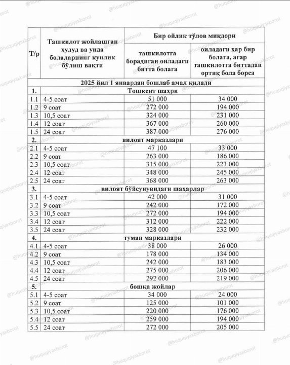 Министерство юстиции Республики Узбекистан объявило о плановом повышении родительской платы за посещение государственных дошкольных образовательных организаций. Новые тарифы вступят в силу с 1 января 2025 года. Это второе изменение стоимости услуг детских садов в текущем году – предыдущее повышение было зафиксировано в июне.