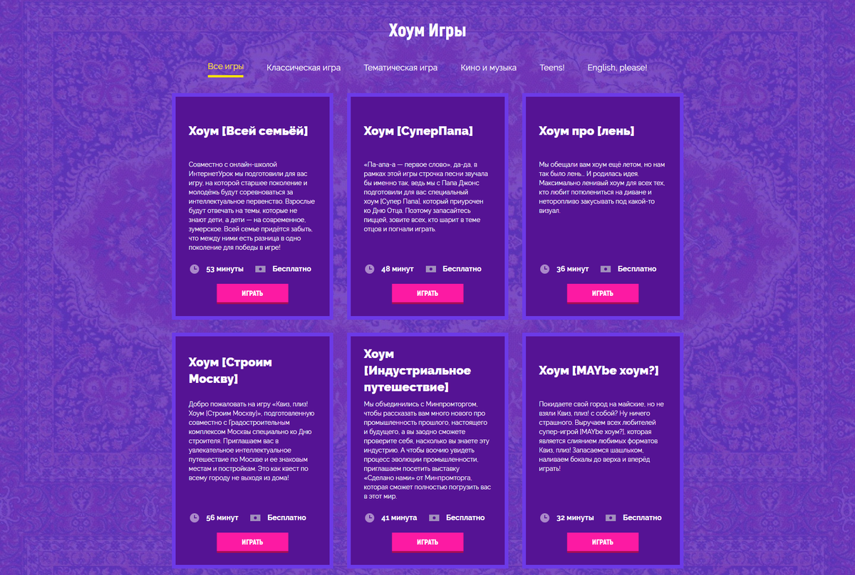 Интеллектуально-развлекательная игра, которая проводится во многих городах России. В первую очередь, сайт нужен для регистрации команд на офлайн игры, которые проводятся в кафе и барах. Однако для любителей домашних посиделок тоже предусмотрен раздел, он называется "Игры Хоум".
