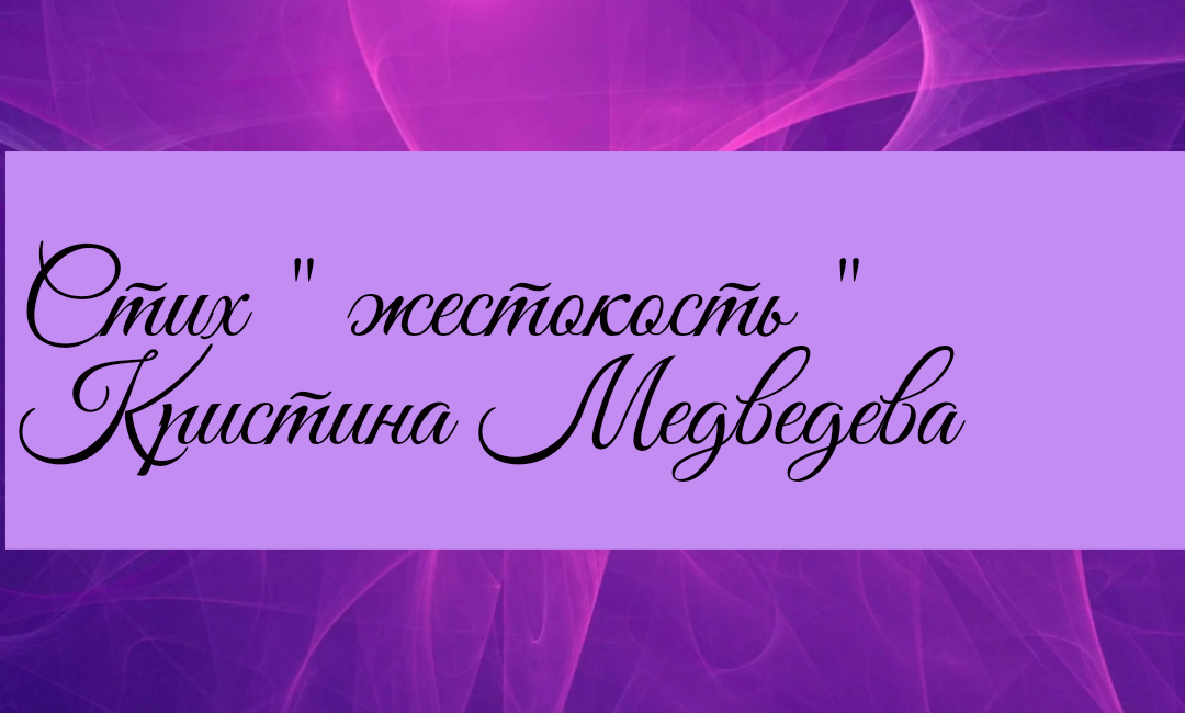 Её избила целая толпа , Когда она тихонько шла из школы. С ней с детства не дружила детвора Считали её скучной , не веселой. Избили сильно : скорая , больница . Родители испуганно в слезах. Им остается только лишь молиться Чтобы их дочь открыла вновь глаза .. Не поделили парня или друга ? Быть может кто-то, что-то там сказал ? Какая разница соперница, подруга Или ты что-то новое узнал? Это неважно! важно тут другое Где человечность люди ? не пойму .. Запомните вы правило простое, Что доброта всегда идёт к лицу И сняв на видео считаетесь крутыми ? А крутость в чём? опять же не пойму .. Жестокость процветает в этом мире И поломает не одну ещё судьбу ... Кристина Медведева (Мой стих )