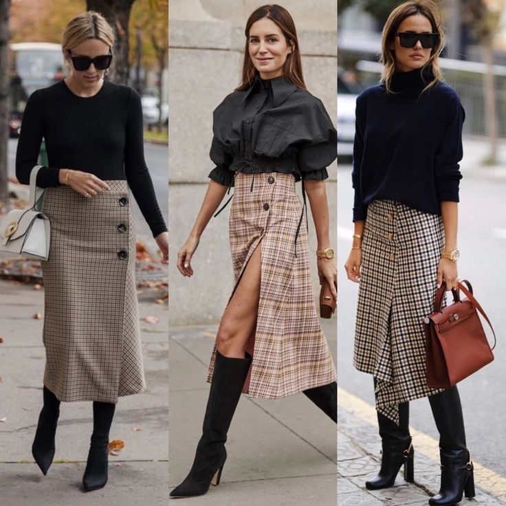 Светлый верх и темный низ. К примеру, можно составить эффектный образ из клетчатой твидовой юбки силуэта «трапеция» и белой футболки. В данном случае лучше использовать короткую юбку, дополнив ее черными ботфортами-чулками.