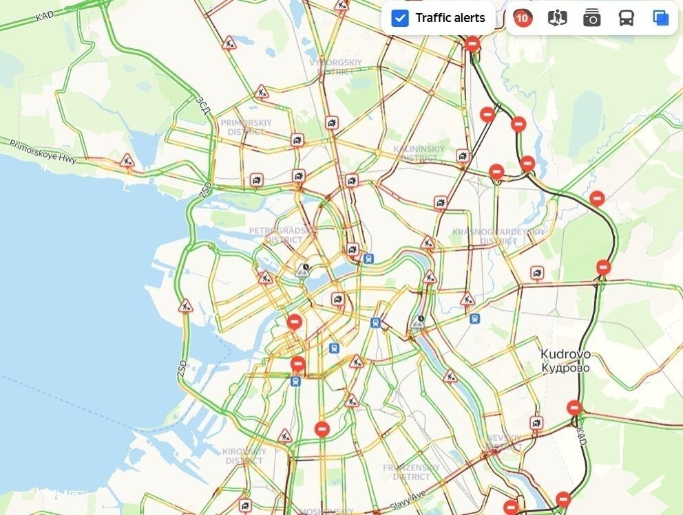 Карта Петербурга покраснела. В нашем городе вечером в среду образовались 10-балльные пробки. Об этом свидетельствуют данные сервиса «Яндекс. Пробки». Плотные заторы зафиксированы на Невском проспекте, набережной Обводного канала, Садовой улице, на ЗСД и КАД. Почти весь город окрашен красными и коричневыми линиями. В Адмиралтейском районе водители стоят в пробках на набережной Обводного канала, улице Боровой и Измайловском проспекте. В Московском районе заторы образовались по Пулковскому и Московскому шоссе. Во Фрунзенском районе заторы есть на Московском проспекте и улице Салова. По прогнозам сервиса «Яндекс.Пробки», только к 21 часу пробок станет меньше.