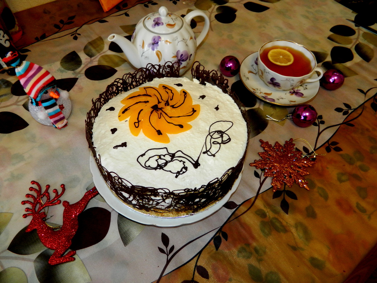 Очень люблю заниматься выпечкой. Кексики, рулетики, пироги сладкие и несладкие, а вот (даже как-то стыдно признаться) торт ни разу в жизни не делала. Как только увижу огромное количество ингредиентов… часть для коржей, другая для крема — и сразу все желание пропадает возиться с такими тортиками часами. Но когда-то нужно начинать. И как раз вчера мне попался рецепт торта, с которым все-таки не нужно так долго возиться. Или мне так только показалось? Готова была к тому, что первый блин комом. А уж с украшением — точно не про меня)))… не оттуда у меня ручки растут)) Берем 100 мл персикового сока и заливаем 15 г желатина. Минут 10 подождем, пока желатин набухнет, затем подогреваем его (я это делаю в микроволновке) и выливаем это количество в 500 мл персикового сока… перемешиваем.