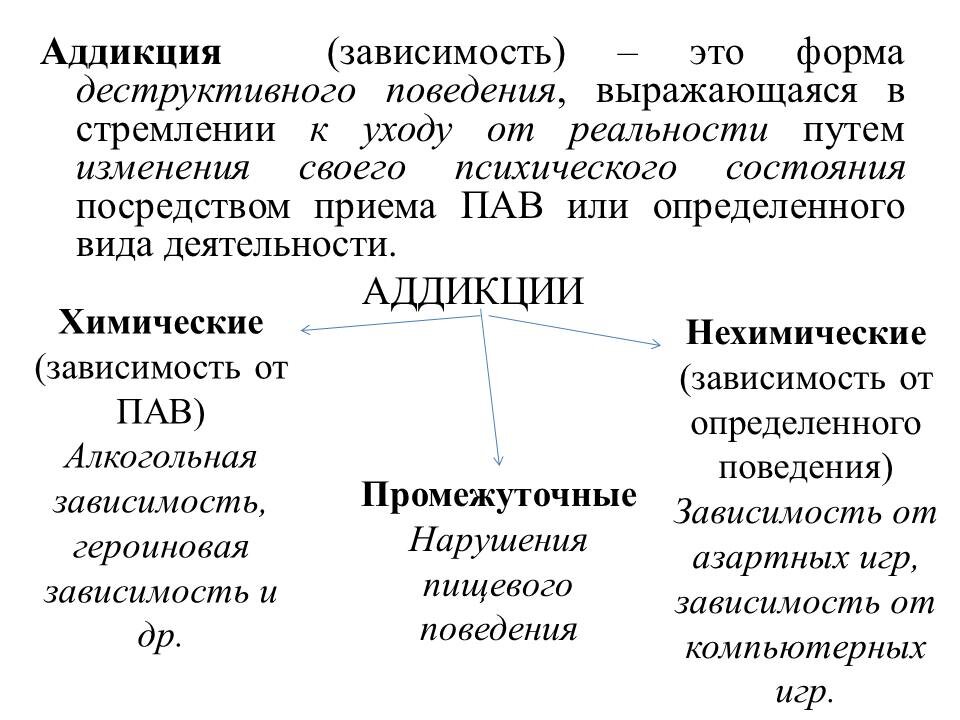«Я выросла в семье, где алкоголь был частым гостем; Мама/папа всё моё детство пили, были скандалы; когда папа напивался, то…» - так порой начинаются истории в моём кабинете. Дети, которые росли в неблагополучных семьях с зависимыми родителями. НО это не всегда только про алкоголизм… Взрослые дети аддиктов (ВДА) — это термин, который используется для описания людей, выросших в семьях, где один или оба родителя страдают от зависимости, чаще всего от алкоголя или наркотиков. Аддикция (зависимость) – это форма деструктивного поведения, выражающаяся в стремлении к уходу от реальности путем изменения своего психического состояния посредством приема ПАВ или определенного вида деятельности. В современных классификациях термины «аддикция» и «зависимость» приходят на смену устаревшим наименованиям «алкоголизм», «наркомания» и т.д. Все аддикции можно разделить на: Люди, которые выросли в неблагоприятной семейной среде часто сталкиваются с множеством психологических и эмоциональных проблем