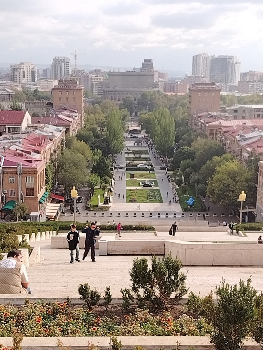 Одной из обязательных для посещения достопримечательностей Еревана является Каскадная лестница или просто Каскад. Это один из главных символов города, поэтому мы к нему пошли буквально на второй день. И посмотреть там действительно есть на что. Но сначала немного истории. Строительство Каскада было запланировано еще в 1924 году главным архитектором Еревана Александром Таманяном. Он спроектировал построить на склоне Канакерского холма комплекс из лестниц, водопадов, цветников, скульптур. Но строительство началось только через 50 лет. Идею Таманяна воплощали уже другие архитекторы в виде проекта, а само строительство началось только в 1980 году. В к концу 80-х стройка закончилась – сначала произошло Спитакское землетрясение, потом распался СССР, затем Карабахская война – было не до Каскада. Вернулись к строительству в 2002 году. Каскад и сейчас не достроен, но то, что сделано, функционирует и очень впечатляет. Сейчас Каскад состоит из пяти уровней, соединенных лестничными пролетами, их о