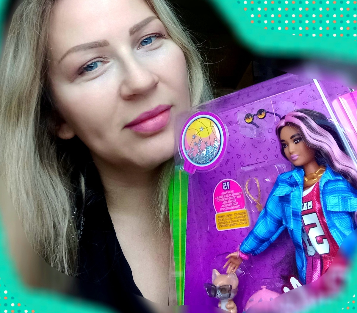 Привет всем дорогие! Дело было так...под Новый год я решила сделать себе подарок) Естественно , для человека , который коллекционирует кукол лучший подарок-это новенькая в коллекции🤭 Большую сумму не хотела тратить , поэтому занялась поисками на маркет плейсах. Пару дней мониторила ситуацию. На Барби экстра с баскетбольным мечом оказалась хорошая скидка. Данная куколка у меня в списке желаний, но на втором месте. Есть куклы на первом и есть на втором))) Решила, заказываю, но посмотрю какая придёт кукла. Если не ровная, то не возьму. На удивление пришла ровненькая красотка) И она мне так понравилась, что я очень рада что заказала ее и забрала домой) Думаю, экстра за 1700 рублей-это приемлемая цена🙂 В жизни кукла оказалась намного интереснее , чем на промо фото. Много ярких аксессуаров. Коробочка пришла целая. Кукла мне напоминает Ольгу Бузову и Леру Кудрявцеву. Наверно из-за яркого макияжа! А еще ,если представить ее с волосами покороче, то похожа на героиню Моники Белучи из фильма Ма