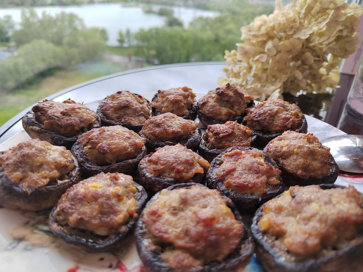 Зелень (петрушка, укроп) – для украшения Аккуратно вычистите шампиньоны от земли и удалите ножки, оставив шляпки целыми. Мелко нарежьте ножки грибов. Нарежьте лук мелко и обжарьте на растительном масле до золотистого цвета. Добавьте к луку нарезанные ножки шампиньонов и обжаривайте ещё 2-3 минуты. Добавьте фарш, соль и перец. Обжаривайте, постоянно помешивая, до готовности фарша (примерно 7-10 минут). Наполните ш