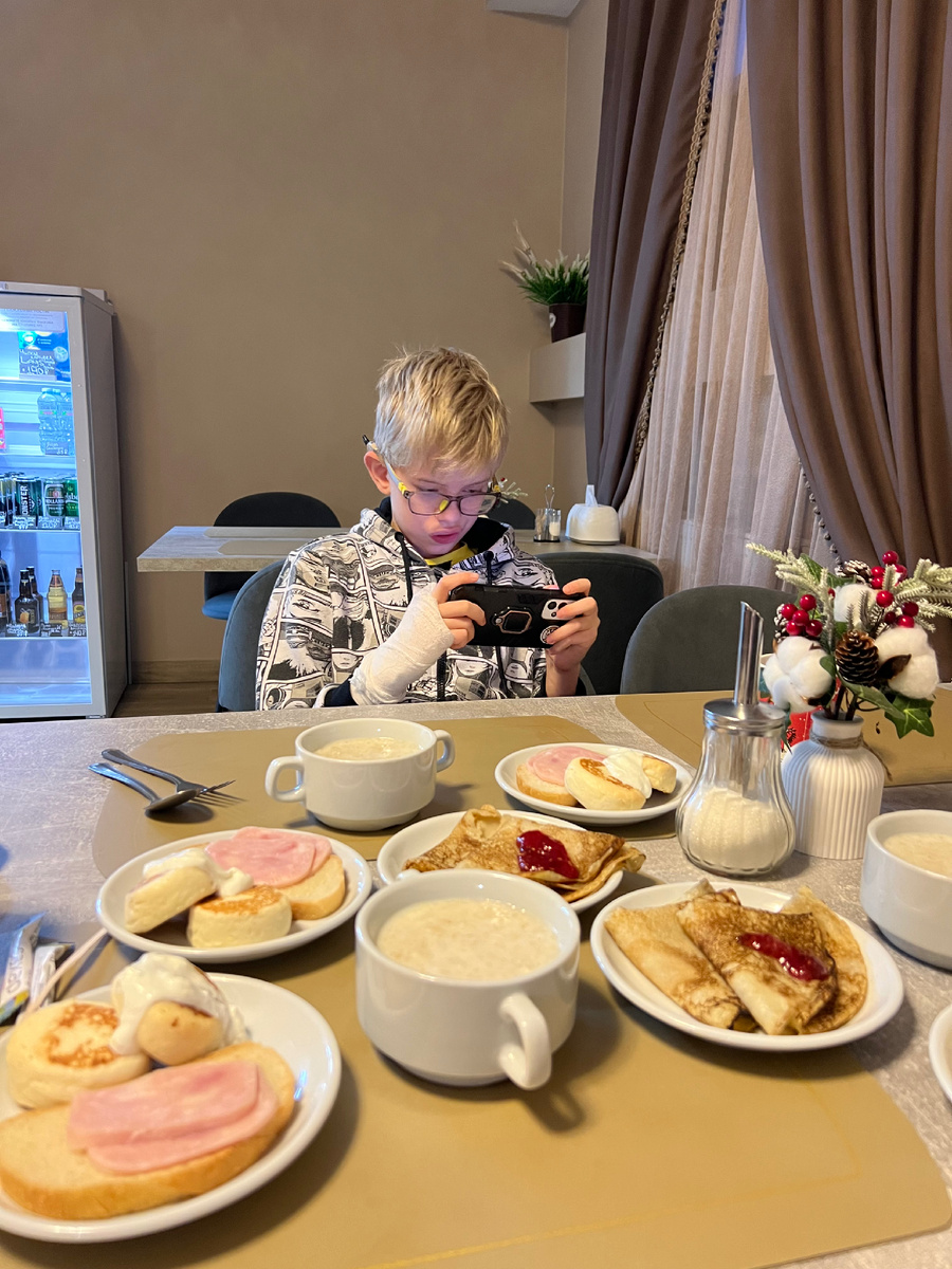 Мы не всегда берём завтрак в гостинице. Когда мы отправляемся в поездки вдвоем с мужем, мы можем отказаться от завтрака в гостинице в пользу завтрака в каком-нибудь интересном кафе. Но, когда едешь в поездку с ребёнком, намного удобнее, конечно, завтрак в гостинице. Вот и в этот раз муж оплатил завтрак. Теперь я покажу вам завтрак. И что не так в этом завтраке? Состав завтрака на 1 человека: Также доступен чай. А вот кофе нужно было покупать отдельно. Для меня это завтрак слишком сладкий и слишком углеводный. Каша, блины, сырники - всё сладкое. Ребенок-то конечно рад, всё по его вкусу. Но для меня и мужа - это пустые калории, которые, скорее всего, быстро переварятся и не дадут долгого насыщения. Я считаю, что лучше все же давать не очень разнообразный, но всё же выбор. Не хватило доброжелательности. Вот честно! Когда я спросила, есть ли каша не на молоке (безмолочная), я услышала короткий и абсолютно незаинтересованный ответ «Нет». Даже в такой, казалось бы мелочи, нет ни ма