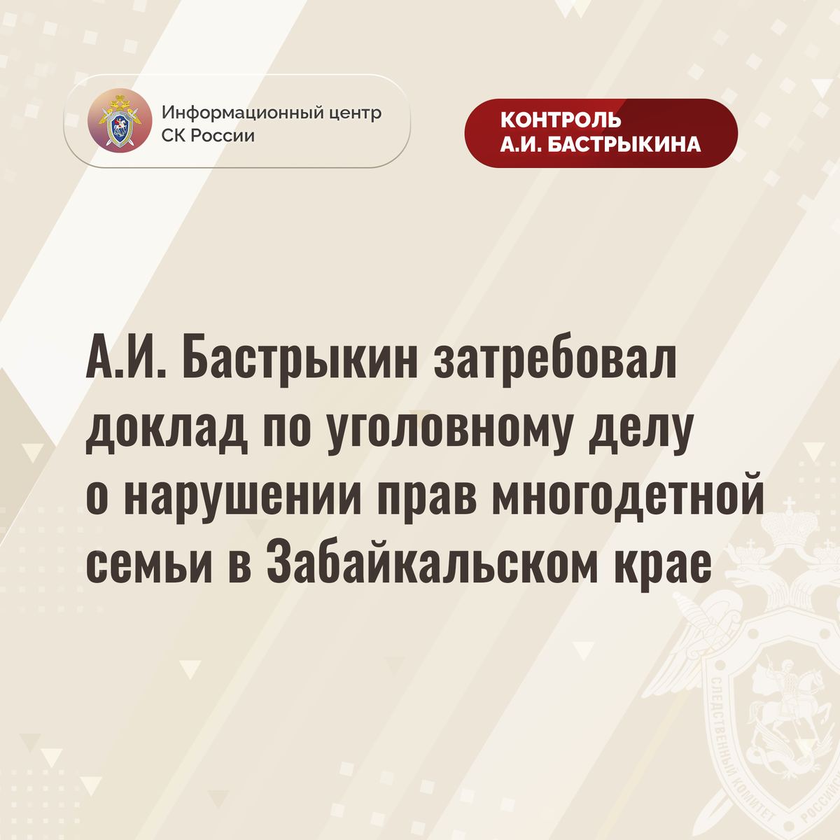 А.И. Бастрыкин затребовал доклад по уголовному делу о нарушении прав многодетной семьи в Забайкальском крае