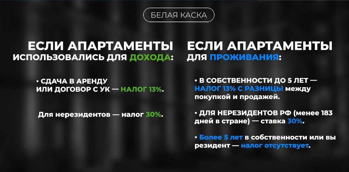 Апартаменты для собственного проживания • В собственности до 5 лет — налог 13% с разницы между покупкой и продажей • Для налоговых нерезидентов, которые живут в РФ меньше 183 дней в году — ставка 30% • Если в собственности более 5 лет или вы резидент — налог платить не нужно Продажа доходных апартаментов •Если сдавали в аренду или подписывали договор с УК — налог 13% - Для нерезидентов при таких же условиях — ставка 30%