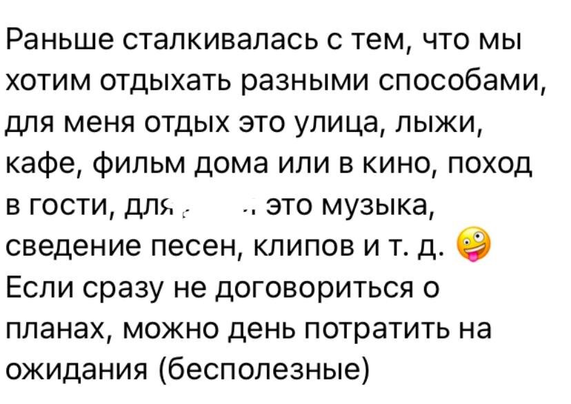 Что делать, если разные взгляды на отдых в новогодние каникулы Итак, кейс: Тема Совместного времяпрепровождения. Есть 2 партнёра, у каждого из них есть свои предпочтения, как проводить выходные/каникулы/совместное время/отдельное друг от друга время. И есть свои ожидания. Конечно, снаружи разбирать проблему проще, чем внутри ситуации, но иногда именно это и нужно. Мои подписчики делились, что в этой ситуации можно только договариваться. И это абсолютно верно, это помогает избегать необоснованных ожиданий и результатов. Но трудности могут возникать и в сам момент обсуждения. Что может помочь: 1⃣ Определить точно проблему. Например, в ваших комментариях было: 🌿разность интересов, 🌿трудность в том, КАК планировать и организовывать совместный отдых, ведь разный взгляд именно на способ планирования; 🌿 решения по деталям (общее обсудить легко, а детали сложнее); 🌿 учесть интересы всей семьи. Когда проблема названа, то легче её и решать. Тогда мы объединяемся против проблемы, а не друг пр