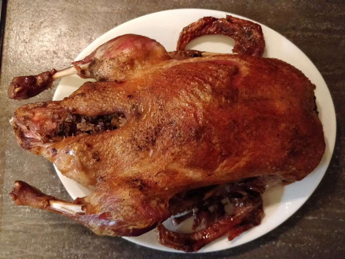 Затем в день запекания гуся достать из холодильника и дать ему нагреться до комнатной температуры.