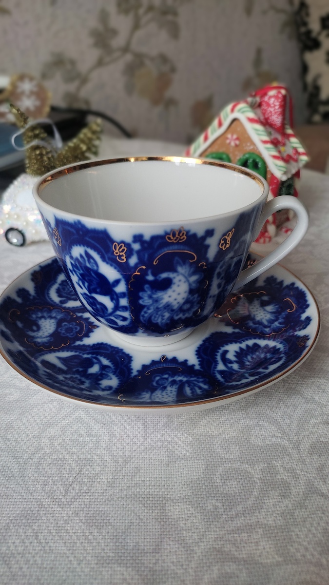 Добрый день всем! Посетила меня недавно навязчивая идея. Не то, что посетила, а покоя не давала! Очень мне захотелось иметь новую чайную пару. С розочками летняя есть, с рябинкой- осенняя, с незабудками- весенняя, а зимней нет. Есть кобальтовый с золотом, но он парадный, праздничный. Четыре дня провела на Авито. Сравнивала, переписывалась с продавцами, торговалась, расстраивалась, опять искала. Остановила свой выбор на чашках ЛФЗ с синей деколью. Это Жар-птица, Синяя птица, Вьюнок и им подобные. Заказала, ещё больше волнений стало. Отслеживала путь из Санкт-Петербурга по треку на приложении Почта. А на почте дрожащими руками разворачивала добротную упаковку. Продавец не подвёл. Пара в идеальном новом состоянии, без следов бытования и дефектов. Я в неё влюбилась с первого взгляда. Судя по клейму 1992-2002 года рождения. Очень лёгкая, почти невесомая. Хоть и форма чашечки весенняя, рисунок мне напоминает морозные узоры. И опять мне покоя не стало. Покупала её как Жар-птицу, у других