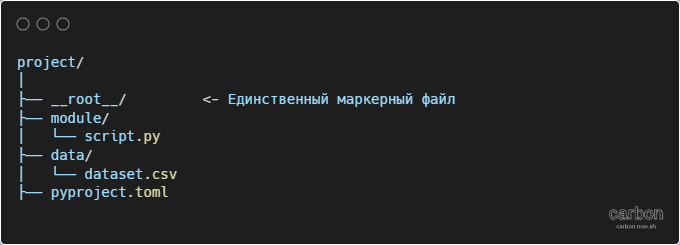 Статья из сборника 101 игра на python. В сборнике я публикую разбор кода учебного репозитория для делающих первые шаги в разработке на python и просто любителей хорошего кода. В репозитории находится сборник программ игр, написанных лёгким языком, по которым ты можешь изучать код. Репозиторий для лёгкого обучения коду на игровых примерах Вот новая версия кода, использующая только файл __root__, и текст объяснения. Абсолютные пути делают работу с файлами более предсказуемой и удобной. Этот подход особенно полезен, если проект имеет сложную структуру директорий. Для определения корневой директории проекта в этой версии используется только один уникальный маркерный файл __root__. Почему __root__? Пример структуры директорий Код функции Как использовать: Так твой проект будет устойчив к ошибкам, связанным с определением корня, а пути станут простыми и управляемыми. Удачи!