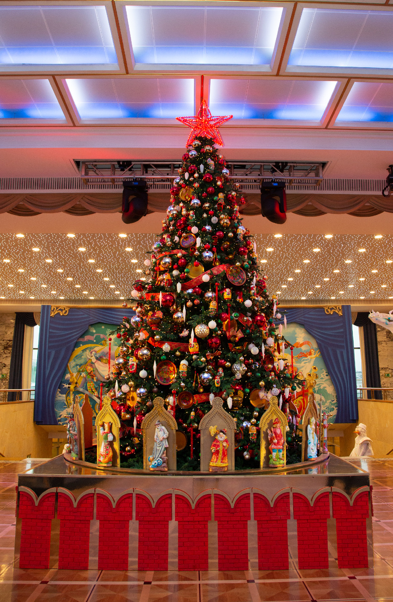Но вот гости – в сопровождении весёлых клоунов и симпатяг-снеговиков - поднимаются по парадной лестнице в просторное фойе. И тут уже дух захватывает буквально у всех: красавицу-ель, увенчанную светящейся звездой – точной копией рубиновой звезды на Спасской башне, украшают не только всевозможные игрушки, но и размещённые по её периметру фигурки сказочных персонажей. Здесь и Кот ученый, и Баба-яга, и Кащей, и Емеля со щукой, и, конечно же, Дед Мороз со Снегурочкой…