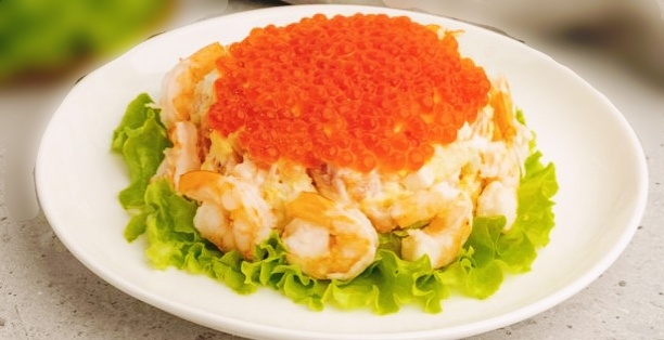 Для приготовления салата «Царский» вам понадобятся следующие ингредиенты: * креветки — 100 г; * слабосолёная сёмга — 150 г; * лавровый лист — 2 штуки; * душистый перец горошком — 5 штук; * красная икра — 1 банка (120 г); * твёрдый сыр — 100 г; * картошка — 2 штуки; * куриное яйцо — 2 штуки; * майонез — 5 столовых ложек; * соль — по вкусу. Для подачи также потребуются листья салата «Айсберг» и лимон. Рецепт: 1. Креветки разморозьте, если необходимо. Картофель отварите до готовности, очистите и нарежьте небольшими кубиками. Сёмгу измельчите, сыр натрите на крупной тёрке. Яйца отварите, очистите и нарежьте белки кубиками. 2. В кастрюлю положите душистый перец горошком, лавровый лист, добавьте соль и доведите до кипения. Кипятите пряности 5 минут, затем опустите в кастрюлю креветки и варите ещё 5 минут. Слейте воду, остудите и очистите креветки. 3. Сформируйте салат. На плоское блюдо выложите слой яичных белков, смажьте его майонезом. Затем распределите слой красной рыбы. Выложите карт