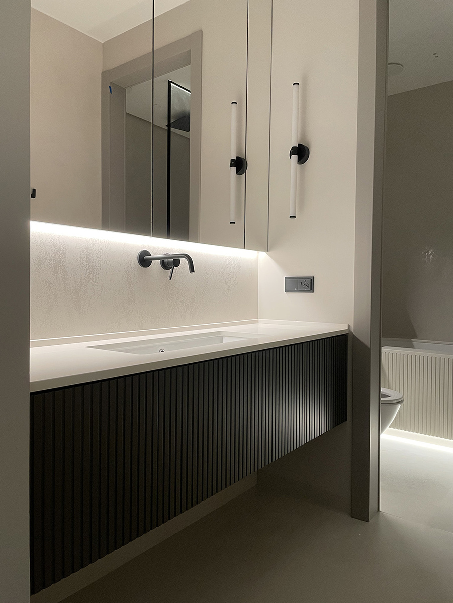 Эта ванная комната продолжает стиль, заданный для всей квартиры. Мы изготовили подвесную тумбу, которая не только эстетична, но и функциональна. Её рифлёный фасад создаёт лёгкий, но выразительный акцент в интерьере. Такое решение объединяет пространство, делая его гармоничным. Экран для ванной мы выполнили в едином стиле с тумбой для целостности дизайна. Подсветка добавляет мягкий свет, подчёркивая текстуру материалов и создавая уютную атмосферу. Важно отметить, что проект ещё не завершён, и в финале мы вернёмся, чтобы снять итоговые фотографии, когда все детали будут доведены до совершенства.