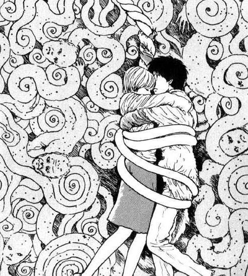 Посмотрел страшилку Дзюндзи Ито, аниме Спираль. Сериал довольно короткий, четыре серии, каждая около двадцати минут. Хотя показалось, что шло оно дольше. У рисовки есть свой стиль. Аниме чёрно-белые, возможно местами использовалась 3d графика, хотя бросалось в глаза не сильно. В этом аниме город подвергается нападкам от странного явления. В различных вариациях появляются спирали и сводят людей с ума,уродуют или уничтожают. Конечно, все, что связано с искажением или опасностью вызывает страх, но у меня аниме вызывало немного диссонанс, потому что спираль сама по себе не страшный, а скорее милый и забавный символ. Если бы использовался какой-то другой, влияющий на подсознание, возможно было бы страшнее. Концовка весьма удручающая, немного делающая все повествование бессмысленным, но аниме со своей оригинальностью и было интересно смотреть.
