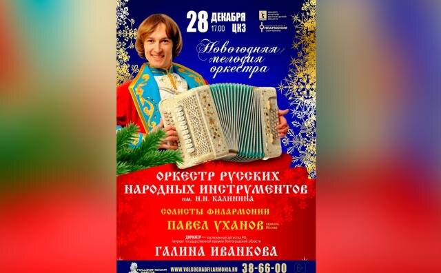 Центральный концертный зал Волгограда приглашает на яркий концерт «Новогодняя мелодия оркестра». Вместе с Оркестром русских народных инструментов им. Н. Н. Калинина под управлением заслуженной артистки России Галины Иванковой выступит заслуженный гармонист России, наш земляк Павел Уханов (г. Москва). В новой программе прозвучат именно те мелодии, без которых не обходится празднование Нового года. В концерте также принимают участие солисты филармонии Елена Плешакова (сопрано), Алексей Шапошников (тенор); солисты оркестра: лауреат всероссийских конкурсов Людмила Попова (малая домра), Надежда Берёзина (альтовая домра), Пётр Рябов (балалайка) Концерт состоится 28 декабря, начало в 17 часов. Знак информационной продукции производителем не присвоен.
