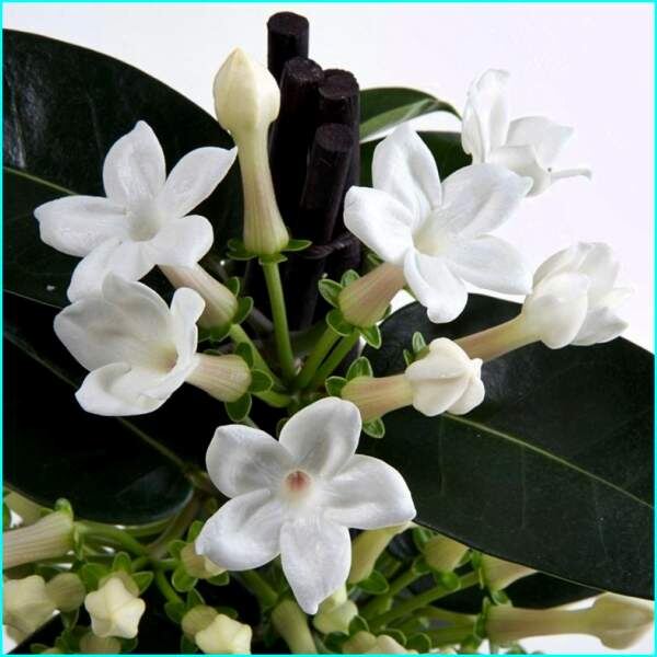 Стефанотис представляет собой лиану, которая может достигать в высоту до трех метров. Листья у этого растения темно-зеленые, кожистые и блестящие, что создает живописный контраст с белыми цветами. Цветы размером около 5 см в диаметре располагаются до 8 штук на одном соцветии и обладают ярко выраженным сладким ароматом. Цветет стефанотис обычно в теплую пору года, но при правильном уходе может радовать своим цветением и зимой.