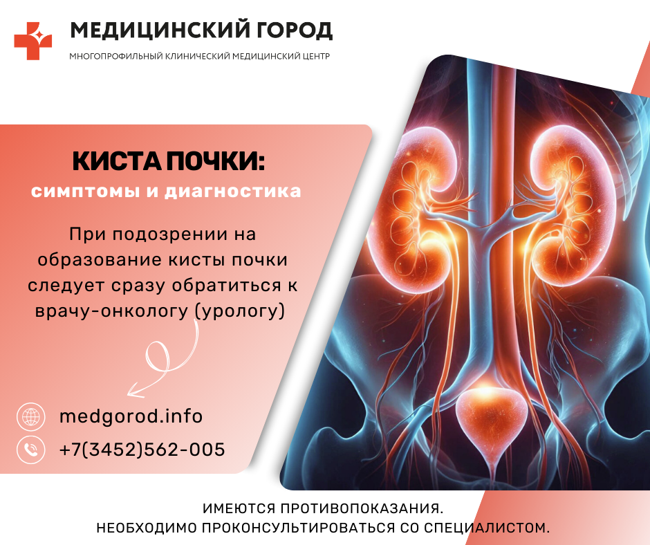 Киста почки – доброкачественное новообразование в виде округлой или овальной плотной капсулы с жидким содержимым, которое образовывается из паренхимы почки. В большинстве случаев киста почки не имеет каких-либо специфических симптомов, т.к. организм, как правило, успевает адаптироваться к ее наличию из-за медленного роста. Но при значительном увеличении новообразования могут возникнуть следующие симптомы: Для подтверждения диагноза врач может назначить: В онкоурологическом отделении МКМЦ «Медицинский город» работают опытные высококвалифицированные врачи-онкологи, которые в своей практике применяют самые современные технологии и предоставляют все виды специализированной и высокотехнологической медицинской помощи пациентам как с доброкачественными, так и злокачественными новообразованиями. Более подробно об услугах , предоставляемых ГАУЗ ТО "МКМЦ "Медицинский город", и их стоимости, вы можете узнать на нашем официальном сайте или по телефону: +7 (3452) 562-005.