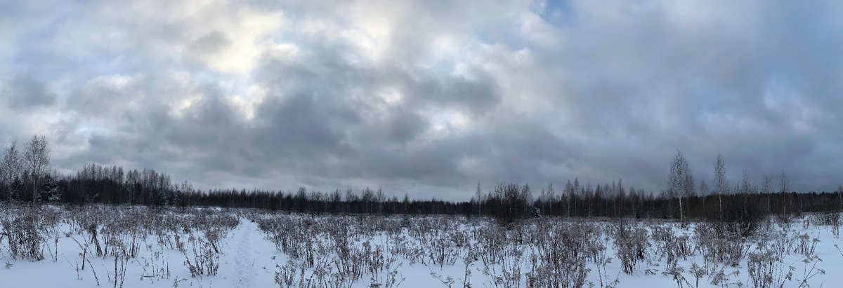 Эти фото были сделаны год назад, если не ошибся, то в декабре 2023 года. Как уже отмечал ранее, зима для меня - не самое лучшее время: Но, что есть, то и имею, в итоге, в один из дней отправился на природу. Сейчас уже не вспомню, на лыжах был, или это была пешая прогулка (хотя, после того, как написал эти строки, присмотрелся к панораме, увеличил её и увидел, что лыжни нет, есть следы, значит - пешая прогулка), но есть такой эффект: Метода у меня работает. В итоге, вышел на поле, ну и решил сделать для истории панораму. Напомню, что смотреть её лучше в полной развертке, тем самым слегка окунувшись в те эмоции, которые и я испытал. Конечно, пока пишу, в голове много мыслей (и красивых, и не особо), но это уже для других статей. Вообще, внимательный читатель заметит, что блог потихоньку превращается не просто в походный, но и о жизни здесь много, есть тонкие моменты. И знаете, нравится выражать свои мысли и эмоции на "бумаге", есть в этом, что-то. Так и наши классики, когда-то излагали