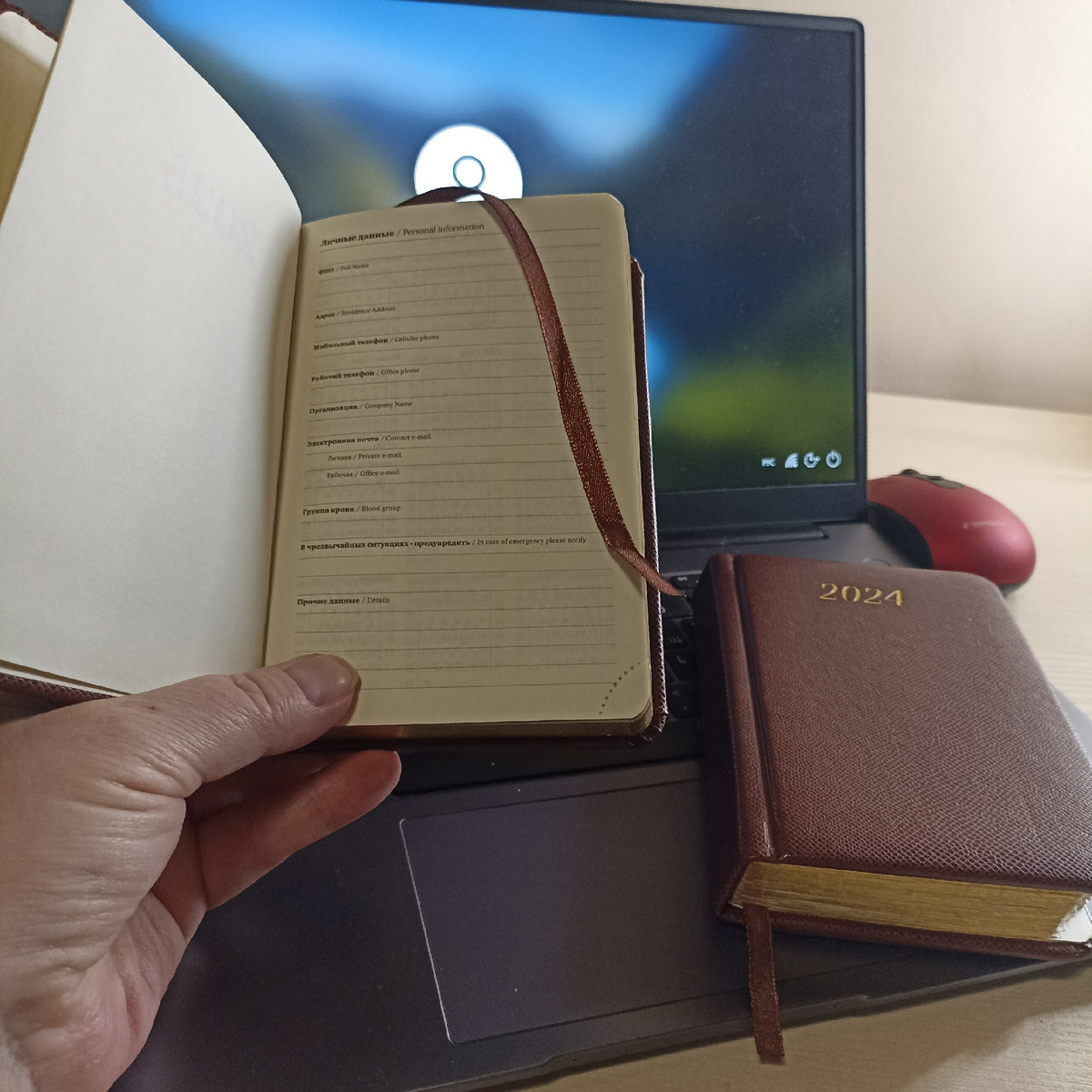 Еще на последней странице ежедневника у меня записана всякая нужная, но не слишком важная инфа вроде давления шин в велосипеде(автомобильное наизусть помню), размер и марка резины летней и зимней - радиусы разные, путаю вечно когда какая. Ширина окон в Прихоне - надо купить ткань на занавески зимой при случае. Цвет, то есть код для колеровки краски стен кухни и спальни. Конечно фото банки я сделала и конечно потеряла его в глубинах телефона. Потом судорожно рыла в кладовке старую банку, переписывала код. После чего вписала маркировку в ежедневник. В прошлом году подкрашивала кухню - пригодилось. Размер ноута по диагонали, свой ИНН, чтобы не лазить каждый раз в Госуслуги, лицевой счет на подачу данных показаний электросчетчика в Прихоне и в квартире. Все то что не нужно сей момент, но приспичит и сразу не сообразить где отрывать инфу. Иногда в ежедневнике появляются заметки, темы статей, напоминалки: позвонить, спросить, купить батарейки, даты когда стриглась... иногда как приспичит постричься почти налысо или покраситься в розовый, смотришь, а со дня последней стрижки только месяц прошел.