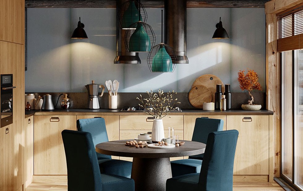 Особенность кухни — открытая планировка рабочей зоны и отсутствие навесных шкафчиков, это дает ощущение легкости и незагроможденности. В доме для отдыха нет необходимости в таком же большом хранении на кухне, как в обычной семейной жизни.
