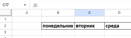 В строке 2, начиная со столбца B, введем дни недели в качестве заголовков, например, «Понедельник», «Вторник», «Среда» и т. д.
