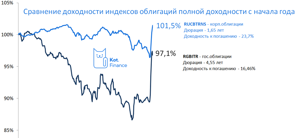 -- На графике отлично видно, как обрадовались облигации решению ЦБ сохранить ключевую ставку. Шире всех улыбнулись дальние ОФЗ. Тут логично: чем длиннее дюрация – тем выше влияние ставки на цену. Но неужели рынок закладывает смену тенденции? Сейчас индекс ОФЗ торгуется у значений 16,5% годовых. Это -4,5% от ключевой ставки. В то время, как облигации А-рейтинга дают около 35% и это выше, чем более низкий ВВВ-рейтинг. А-рейтинг самый многочисленный, и там есть потенциально-проблемные звенья: 🔹 М.Видео 🔹 Самолет 🔹 АФК Система Но справедливости ради, фестиваль дефолтов начался с самых маленьких и слабых: НИКА, КЭС, Селлер, и другие. В А-рейтинге дефолтнула только Росгеология. Такие ситуации создают возможности. И не смотря на резкий отскок с пятницы, рынок облигаций еще дает много отличных