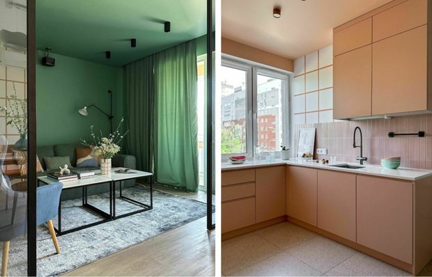 Вдохновляйтесь и берите на вооружение понравившиеся идеи! Дизайнеры из студии Bilbao design создали яркий и функциональный интерьер в новостройке. В квартире много цвета и красивых декоративных решений. Собрали интересные идеи из проекта, которые точно заслуживают вашего внимания. Главной фишкой проекта стало контрастное цветовое сочетание холодного бирюзового и теплого персикового. Пастельный персиковый оттенок гармонично дополняет кухню и ванную комнату. Он усиливает ощущение тепла, визуально расширяет пространство и создает легкую умиротворяющую атмосферу. Бирюзовый, наоборот, относится к холодной части спектра. В гостиной этот цвет плавно переходит со стен на потолок, а затем и в обивку дивана. Использование контрастных оттенков в одном пространстве создает динамичный и энергичный эффект. Угловой кухонный гарнитур разместили около окна. Мебель объединили по цвету с потолком, что завершило композицию и визуально разделило пространство зоны. Гарнитур делали на заказ под размеры помещ