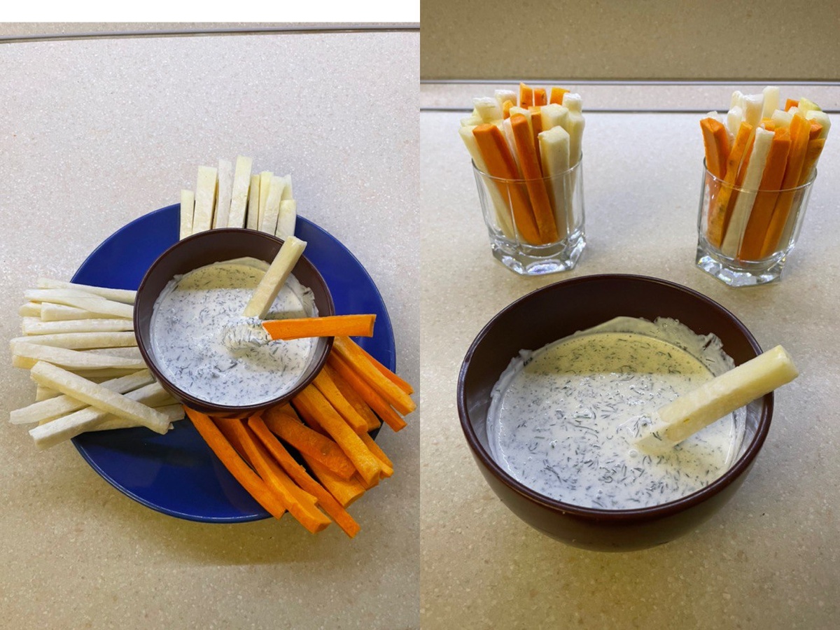 Здравствуйте! Хочу поделиться с вами самой простой, но очень вкусной закуской на Новый год. Очень спасает за новогодним столом, особенно когда есть уже не хочешь, а вроде надо… Можно всё положить на одно блюдо, а можно подавать в стаканчиках. Взяла из погребка редьку дайкон, кольраби и морковку. Очень вкусно если дайкон заменить зеленой редькой. Нарезала всё соломкой. Вместо кольраби можно взять свежие огурцы. Тогда закуска будет смотреться ярче и интереснее. Для соуса нужна сметана, побольше укропа ( у меня мороженный), чуть-чуть соли и чеснок Вкусно будет если добавить Дижонскую горчицу. Можно каждую палочку есть с пожеланиями! Вспомним новогодний мультфильм: Говорят, под Новый Год, Что ни пожелается — Все всегда произойдет, Все всегда сбывается! Вот и загадываем желания! Пусть с каждой съеденной полочкой исполнится ваше желание! В промежутке можно и налить, под хорошее пожелание почему бы и не выпить… 🥂Желаю, чтобы в этот год Змеи кошелек был, как змеиная кожа: