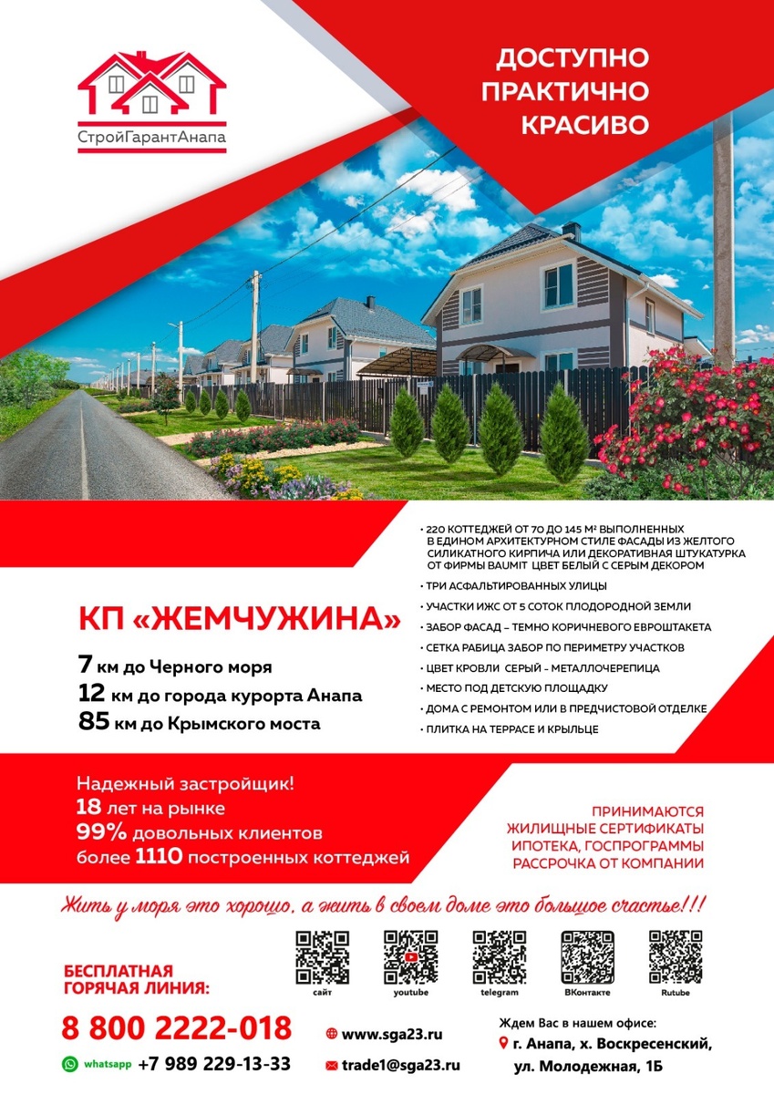 Здесь современный комфорт 🛋️ сочетается с природной красотой 🌳, создавая уникальную атмосферу для вашей семьи. Расположенный в живописном месте, комплекс предлагает широкий выбор квартир различной планировки, чтобы каждый мог найти свой уголок счастья. 🏠💖 Качественные материалы и инновационные технологии гарантируют долговечность и безопасность вашего жилья, а инфраструктура комплекса обеспечивает все необходимое для комфортной жизни: от парковок и спортивных площадок 🚴♂️ до детских садов и магазинов в шаговой доступности. 🛒🏫 "Жемчужина" - это не просто дом, это место, где ваша семья будет расти и развиваться, окруженная заботой и красотой природы. 🌺👨👩👧👦 Выберите качество жизни для себя и своих близких - выберите "Жемчужину" от СтройГарантАнапа! 🌈 Жить у моря это хорошо, а жить в своем доме это большое счастье!!! ЗВОНИТЕ - 8-800-2222-018 Пишите - wwww.sga23.ru Бесплатная горячая линия: 8-800-2222-018 WhatsApp: 8 (989) 229-13-33 Наш адрес: Краснодарский край, Анапский р