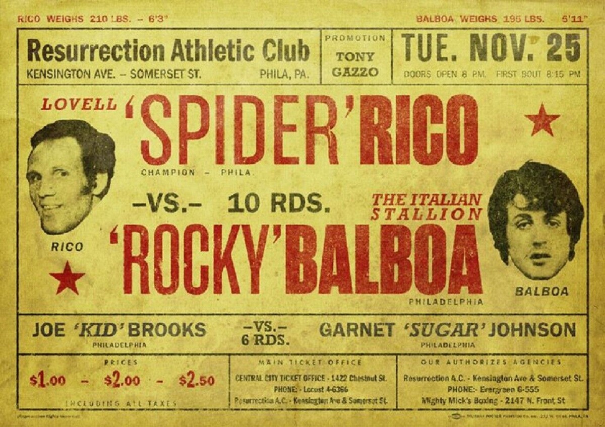 Первый фильм начинается 25 ноября 1975 года с поединка против Паука Рико (билет представлен ниже), а легендарный бой закрывший фильм проходит 1 января 1976 всё просто. Действие фильма укладывается в месяц с небольшим никаких вопросов. Рокки здесь упомянет что ему 30 лет, значит он родился в 1945м. Пока что всё стабильно, но взглянем на продолжение...